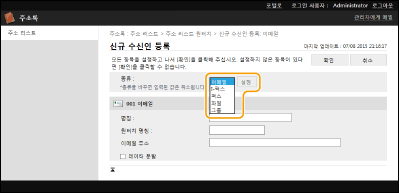 4 | 필요한 정보를 등록하고 [확인]를 클릭합니다. 표시되는 항목은 수신인 유형에 따라 달라집니다. 등록할 정보에 대한 자세한 정보는 주소록에 수신인 등록를 참고하십시오. |