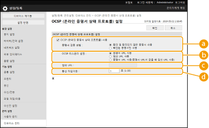 통신 중 상대방으로부터 수신한 인증서가 유효한지 여부를 확인하는 방법에는 두 가지가 있습니다. 기기에 등록된 인증서 해지 목록(CRL)과 비교하는 것과 OSCP(온라인 인증서 상태 프로토콜) 응답기(OCSP를 지원하는 서버)에 대해 문의하는 것입니다. 환경에 따라 인증서 만료를 확인하는 방법을 설정합니다. 관리자만 이 등록을 수행할 수 있습니다.