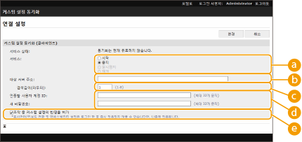 다음과 같은 경우 4단계를 수행하지 않고도 동기화를 설정할 수 있습니다. 동기화할 기기가 같은 라우터에 연결되어 있는 경우. 서버 기기에서 <사용자 인증 사용>이 <설정>으로 설정되어 있고(<사용자 인증 사용> 참조) 사용자 인증이 로그인 서비스로 설정된 경우(로그인 서비스 변경 참조) 클라이언트 기기의 [인증할 사용자 계정 ID:]에서 아무것도 입력하지 않은 경우(항목이 null일 경우) 커스텀 설정 동기화 서비스가 서버 기기에서 시작된 경우(기기가 서버/클라이언트 기기인 경우 서버 서비스 및 클라이언트 서비스를 동시에 시작하여 설정을 변경할 수 있음) 동일한 네트워크 상에서 커스텀 설정 동기화를 위한 서버 기기가 1개만 있는 경우 다음 경우에는 검색을 통해 클라이언트 기기를 연결할 수 없습니다. 대상 서버 주소에 IPv4 주소를 입력하십시오. 서버 기기의 네트워크 설정에 IPv4와 IPv6가 모두 포함되는 경우, IPv6가 우선적으로 사용되고 클라이언트 장치에서 IPv6가 비활성화됩니다. 서버 기기의 네트워크 설정에 메인 라인을 사용하고 클라이언트 기기의 네트워크 설정에 서브 라인을 사용하는 경우 서버 기기의 네트워크 설정에 서브 라인을 사용하는 경우, 다음 설정을 지정하십시오. 서버 및 클라이언트 기기: 메인 라인 또는 로컬 호스트의 IP 주소를 대상 서버의 주소로 입력합니다. 클라이언트 기기: 서버 기기의 서브 라인의 IP 주소를 대상 서버의 주소로 입력합니다. |