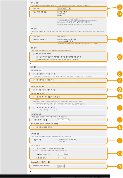 사용자 로그인 방식(로그인 방법) 및 인증 장치(인증 장치)를 지정합니다. 인증 장치는 아래의 설정을 구성하기 전에 먼저 설치해야 합니다.