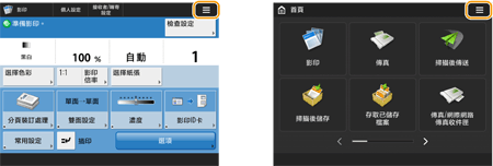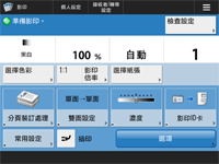 按 <首頁> 畫面及基本功能畫面顯示的 以便自訂畫面,例如重新排列按鈕或建立快速鍵。自訂觸控面板顯示幕![]() 您可以變更與畫面顯示有關的設定,例如開啟本機電源後立即顯示的畫面,以及是否對於剩餘紙張和碳粉顯示訊息。<顯示設定> 您可以設定經過一段時間不操作將顯示的畫面。<自動重設後的功能> |