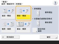 若要指定原稿方向,請按下 <設定詳細資訊>。原稿的正反面上下方向相同時,請選擇 <書本類型>。原稿的正反面上下方向相反時,請選擇 <日曆類型>。