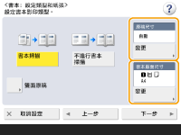 按下 <原稿尺寸> 中的 <變更>,並選擇原稿尺寸。如果您選擇 <自動>,則會依照原稿尺寸自動選擇小冊子尺寸。