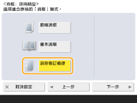 1 | 按下 <原稿消框>,然後設定 <原稿尺寸>。 ![]() 如果 <原稿尺寸> 中顯示的尺寸與您設定的原稿尺寸不同,請按 <變更> 以選擇尺寸。 |