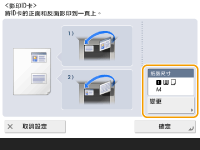 這項功能可讓您將身分證的正反兩面影印到同一張紙上。這項功能在影印駕照等身分證明文件時非常實用,因為身分證兩面影像的方向和列印位置,會依照紙張大小自動對齊。
