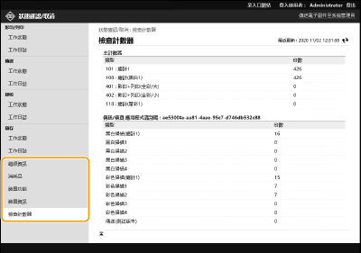 您可以檢查有關本機的各種資訊,例如錯誤資訊、剩餘的紙張和碳粉量、有關連接的選購設備資訊,以及截至目前已經列印的頁面總數。