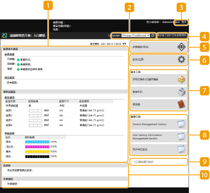 部分顯示項目與功能只有在以管理員權限身分登入時才可使用。 如果有多個使用者同時操作遠端使用者介面,或本機控制面板與遠端使用者介面同時操作,則最後執行的操作會生效。 |