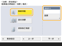 <消框>。1 | 按下 <原稿消框> 並勾選 <原稿尺寸>。 ![]() 如果 <原稿尺寸> 中顯示的尺寸不同於原稿尺寸,請按下 <變更> 選擇尺寸。您只能掃描觸控面板顯示幕上顯示的原稿尺寸。 |
