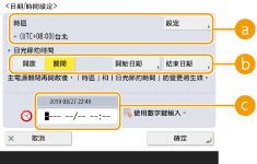 若要設定日光節約時間,請按 <開啟> 並設定 <開始日期> 和 <結束日期> 的日期/時間。若要設定日期,請指定一週的天數和一個月的週數。