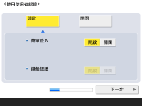 若要加強本機的安全,請在使用使用者認證的系統下使用本機。 ![]() 本機設定為採行使用者認證作為登入服務。有關詳細資訊,請參閱指定個人認證管理設定。 ![]() 對於 <使用使用者認證> 按 <開啟>,並對於要使用的登入方法按 <開啟>,然後按 <下一步>。 如果不採行使用者認證,對於 <使用使用者認證> 按 <關閉>,並且按 <確定>,然後前進至步驟 5。 ![]() 如果除了在本機中註冊的「Administrator」使用者之外就沒有任何其他系統管理員,請指定以下設定。 ![]() 若要透過停用「管理員」使用者及註冊新系統管理員來加強本機的安全性,請按下 <是>。在 <註冊管理員> 中輸入 <使用者名稱> 和 <密碼>,然後按下 <確定>。視需要指定 <電子郵件地址>、<部門識別碼> 及 <顯示名稱>。如需詳細資訊,請參閱 在本機裝置上註冊使用者資訊。下次登入時,「管理員」使用者將被停用。 若要以「Administrator」身分進行操作,請按下 <否>。 ![]() ![]() 選擇顯示登入畫面的時機。如果選擇 <選擇功能時顯示>,請按下 <功能> 和 <彩色影印/列印>、選擇要顯示登入畫面的功能,然後按下 <良好>。此外,請在 <設定/註冊> 畫面上選擇要顯示登入畫面的設定項目。 如果在 <簡單登入> 和 <鍵盤認證> 中選擇 <關閉>,請按下 <確定>。繼續步驟 5。 如果在 <簡單登入> 或 <鍵盤認證> 中選擇 <開啟>,請按下 <下一步>。 ![]() ![]() 若只要在登入畫面上透過數字鍵輸入的方式進行認證,請按下 <開啟>。 如果在 <簡單登入> 中選擇 <關閉>,請按下 <確定>。繼續步驟 5。 如果在 <簡單登入> 中選擇 <開啟>,請按下 <下一步>。 ![]() ![]() 設置是否需要使用者輸入 PIN 或圖片登入時的圖案,然後按 <下一步>。 ![]() ![]() 當您想使用「圖片登入」且本機處於適合使用列印功能的情況下時,按下 <開啟>。此設定允許進行下列操作:使用強制保留列印功能、使用從電腦傳送的列印資料進行使用者註冊,以及在使用者使用本機進行列印時預設顯示適合各使用者的登入畫面。如需詳細資訊,請參閱 指定強制保留列印設定、<使用者註冊方法> 及 <變更簡單登入螢幕的預設顯示>。 ![]() ![]() 選擇「圖片登入」畫面上的預設按鈕數字,並且按 <確定>。 | |