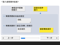 如果不使用「設定指南」,請按下步驟 1 中的 <結束設定導引>。 按下 (設定/註冊) 可稍後分別指定在「設定指南」期間組態的設定。 |