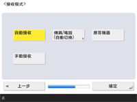 指定使用傳真功能所需的設定。 ![]() 如果本機沒有傳真功能,請繼續步驟 10。 ![]() 輸入傳真號碼,並且按 <下一步>。 有關傳真設定的資訊,請參閱傳真線路設定。 ![]() ![]() 按 <設定>,並輸入使用者名稱,然後按 <下一步>。 ![]() ![]() 選擇線路類型,然後按 <下一步>。 ![]() ![]() 僅使用傳真功能時,請按下 <自動接收>;或當電話或聽筒連接到機器時,請按下 <傳真/電話(自動切換)>,然後按下 <確定>。 | |