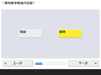 指定網路連線的設定。 ![]() ![]() 對於 <使用IPv4> 或 <使用IPv6> 按 <開啟>,並且按 <下一步>。您也可以使用 IPv4 和 IPv6。 如果對於 <使用IPv4> 和 <使用IPv6> 按 <關閉>,並且按 <確定>,請略過網路設定,並前進至步驟 9。 ![]() 如果對於 <使用IPv4> 按 <開啟>,請指定下列設定。 ![]() 若要自動取得 IP 位址,請按 <DHCP> 或 <自動IP>,然後按 <下一步> 或 <確定>。 若要手動取得 IP 位址,請清除對 <DHCP> 或 <自動IP> 的選擇,並按 <IP位址>、<子網路遮罩> 和 <閘道位址> 輸入各個值,然後按 <下一步> 或 <確定>。 有關 IPV4 位址設定的資訊,請參閱設定 IPv4 位址。 ![]() 如果對於 <使用IPv6> 按 <開啟>,請指定下列設定。 ![]() 按 <開啟> 使用無狀態位址或按 <關閉> 不使用無狀態位址,然後按 <下一步>。 有關 IPv6 位址的資訊,請參閱設定 IPv6 位址。 ![]() 指定無狀態位址後,指定下列設定。 ![]() 按 <開啟> 使用手動位址或按 <關閉> 不使用手動位址,然後按 <下一步>。 若要使用手動位址,請按 <手動位址>、<前置碼長度> 和 <預設路由器位址> 輸入各個值。 ![]() 指定手動位址後,指定下列設定。 ![]() 按 <開啟> 使用 DHCPv6 或 <關閉> 不使用 DHCPv6,然後按 <確定>。 | |