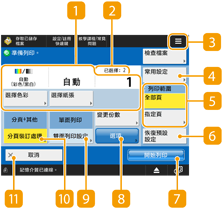 顯示例如要列印的紙張尺寸和列印份數等設定狀態。請務必確認設定以便可正確列印。若要變更設定,請按顯示區域下方的按鈕。若要變更列印份數,請使用數字鍵輸入數量。