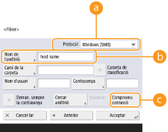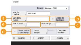 Si seleccioneu <Windows (SMB)>, es mostren els botons <Cercar amfitrió> i <Examinar>. Per especificar fàcilment un servidor de fitxers/Espai avançat, cerqueu o visualitzeu la xarxa.