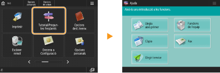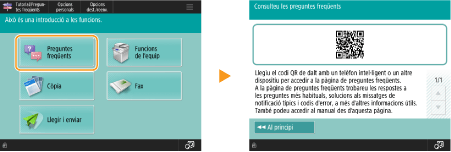 Vegeu la guia de funcions i la pàgina de preguntes més freqüents (FAQ)Premeu <Tutorial/Preguntes freqüents> per visualitzar una pantalla que us ensenya què podeu fer amb les funcions de l'equip i també consells per utilitzar les funcions de còpia, lectura, etc. Vegeu aquesta pantalla quan vulgueu obtenir més informació sobre quines funcions estan disponibles i com utilitzar-les. També podeu accedir a la pàgina de preguntes més freqüents (FAQ) des d'un dispositiu mòbil.