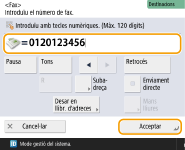 Per enviar faxos a números internacionalsIntroduïu el codi d'accés internacional, el codi de país i el número de fax, en aquest ordre. Si no podeu connectar amb la destinació internacional, premeu <Pausa> per inserir una pausa entre el número i el número següent.