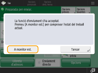 Si <Mostrar avís en acceptar el treball> està establert en <On>, la pantalla <Monitor estat> pot aparèixer a partir de la pantalla següent mostrada després de rebre un treball d'enviament. <Mostrar avís en acceptar el treball>