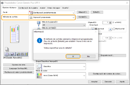 Podeu establir una hora per començar a imprimir, la qual cosa és útil quan s'imprimeixen grans quantitats de documents a la nit, etc.