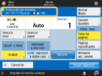 Mostra l'estat de l'opció, com la mida de paper per imprimir i el nombre d'impressions. Assegureu-vos de confirmar les opcions per imprimir correctament. Per modificar les opcions, premeu el botó que hi ha a sota de la secció de la pantalla. Per canviar el nombre d'impressions, introduïu el nombre amb les tecles numèriques.