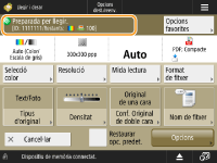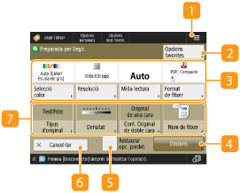Mostra l'estat de l'opció, com ara la resolució i la mida de lectura. Assegureu-vos de confirmar les opcions per llegir correctament. Per modificar les opcions, premeu el botó que hi ha a sota de la secció de la pantalla. Per obtenir informació sobre els formats de fitxer, consulteu