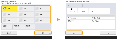U funkce Kopie/Skenovat a odeslat můžete rovněž nastavit, aby stroj při vyvolání uložených nastavení nezobrazoval potvrzovací obrazovku.