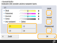 Po provedení úprav můžete uložit až čtyři nastavení. Pro nastavení barvy stiskněte <Vyvolat/Uložit>