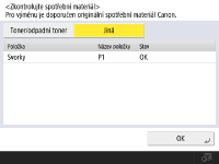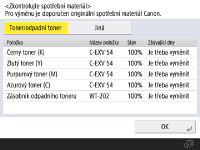 I když je v okně <Zbývající dny> zobrazeno upozornění <Je třeba vyměnit>, neprovádějte výměnu, dokud se v oblasti zobrazení stavu nezobrazí zpráva vyzývající k výměně spotřebního materiálu (ve spodní části displeje dotekového panelu).