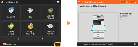 Když je bubnová jednotka téměř na konci své životnosti, ve spodní části obrazovky se zobrazí hlášení vyzývající k výměně bubnové jednotky. Stiskněte ikonu v pravé dolní části obrazovky a vyměňte bubnovou jednotku podle pokynů na obrazovce.