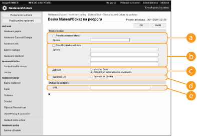 Na displeji dotekového panelu lze zobrazovat zprávy pro uživatele. Zprávy se mohou zobrazovat v dolní části displeje dotekového panelu nebo v samostatném překryvném okně a způsob zobrazení můžete vybrat podle typu zprávy nebo uživatele. Když se zpráva zobrazí v překryvném okně, můžete stejnou zprávu zobrazit také na portálové stránce Remote UI (Vzdálené UR). Pro zadání těchto nastavení jsou vyžadována přístupová práva administrátora (správce).