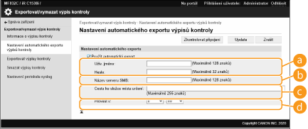 Pokud je povolena možnost [Nastavení automatického exportu výpisů kontroly], nemůžete protokoly auditu odstranit ručně.