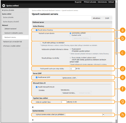 Chcete-li zadat ID Active Directory/LDAP Server/Microsoft Entra ID jako další ověřovací zařízení, musíte zaregistrovat informace o serveru použitém k ověření. Podle potřeby proveďte kontrolu připojení.