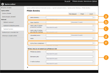 Zde zadejte hostitelský název serveru Active Directory nebo adresu IPv4. Při použití sekundárního serveru zadejte jméno v [Jméno nebo IP adresa sekundárního hostitele].