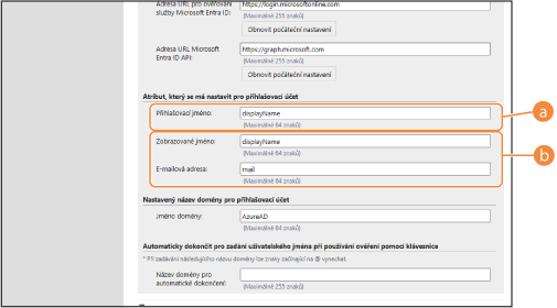 Zde zadejte datová pole (názvy atributů) pro přihlašovací jméno, zobrazované jméno a e-mailovou adresu každého uživatelského účtu na serveru služby Active Directory (Příklad: sAMAccountName, cn, pošta).