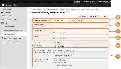 Když používáte klíč a certifikát, stiskněte [Klíč a certifikát]. Stisknutím [Export certifikátu...] můžete exportovat certifikát, který má být zaregistrován do Microsoft Entra ID. Zadejte tajný klíč vydaný službou Microsoft Entra ID. Pokud používáte [Klíč a certifikát], není nutné tajný klíč zadávat.