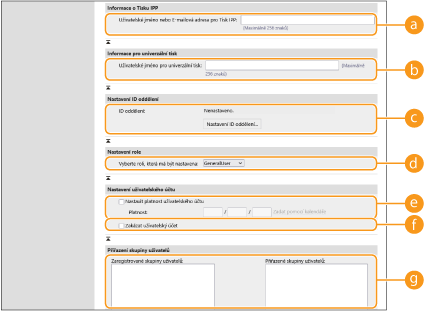 [Nastavení tisku IPP], můžete zadat e-mailovou adresu nebo uživatelské jméno použité v účtu uživatele, ke kterému jsou přidruženy úlohy tisku IPP.