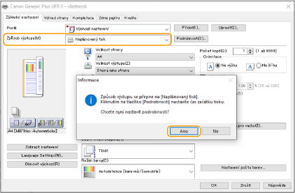 Vyberte [Naplánovaný tisk] z [Způsob výstupu] a klikněte na [Ano].