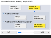 Vyberte načasování pro zobrazení přihlašovací obrazovky. Pokud vyberete <Zobrazit při výběru funkce>, stiskněte <Funkce> a <Barevné kopírování/tisk>, vyberte funkci, pro kterou se má obrazovka přihlášení zobrazit, a stiskněte <OK>. Na obrazovce <Nastavení/Uložení> také vyberte položky nastavení, pro které se má zobrazit obrazovka pro přihlášení.