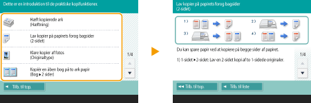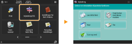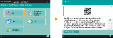 Vis funktionsvejledningen og FAQ-sidenTryk på <Vejledning/OSS> for at vise et skærmbillede, der fortæller, hvad du kan udføre med funktionerne på maskinen, samt tips til kopiering, scanning mv. Vis dette skærmbillede, når du vil lære mere om de tilgængelige funktioner, og hvordan du bruger dem. Du kan også få adgang til FAQ-siden fra en mobilenhed.