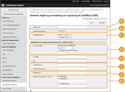 Certifikater, der er genereret på denne maskine, har ikke en CA-signatur, og det kan muligvis medføre kommunikationsfejl med nogle kommunikationspartnere. For at anmode om et certifikat med en CA-signatur er det nødvendigt med data til anmodning om signering af certifikat (CSR-data). En bruger, der logger på med administratorrettigheder, kan anmode om en CSR.