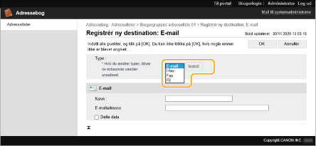 [Adresseliste for Administratorer] er kun tilgængelig for administratorer, der logger ind med administrator- eller enhedsadm-rettigheder.