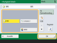 <Orig. indhold Retning> vælg <Øverst ved fjern kant> eller <Øverst ved kant> alt efter retningen af originalen tryk på <OK>.Angivelse af flere modtagere, inklusive faxerIndstiller du <Aktivér fax i scannings- og sendefunktion> til <Til>, kan du angive faxmodtagere fra skærmbilledet Grundlæggende scanningsfunktioner (<Vis faxfunktion>). Denne indstilling er praktisk til angivelse af flere modtagere inklusive faxer, som f.eks. når du gemmer en kopi af en sendt fax på en filserver.