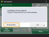Når <Vis meddelelse, når job er godkendt> er indstilet til <Til>, vises skærmen <Status Monitor> fra den følgende skærm, der vises, når et afsendt job er modtaget. <Vis meddelelse, når job er godkendt>