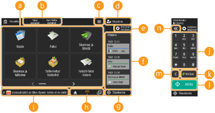 Näiden painikkeiden avulla voit avata perustoimintojen näyttöjä, kuten "Kopio" ja "Skannaa ja lähetä".