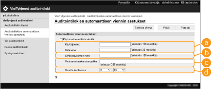 Huomaa, että jos käytät palvelinta, joka ei tue SMB v3.0/3.1 ‑salattua tiedonsiirtoa, valvontalokien tiedot kulkevat salaamattomina koko matkan, kun niitä viedään automaattisesti.