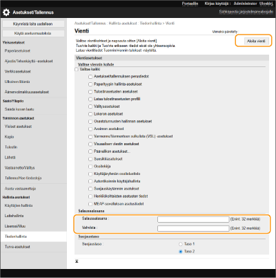 [Salaussalasana] -kohdan salasana tarvitaan vietyjen asetustietojen tuomiseen. Käytä aakkosnumeerisia merkkejä.