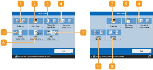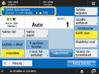 Näyttää asetustilan kuten tulostuksen paperikoon ja tulosteiden määrän. Muista varmistaa asetukset tulostaaksesi oikein. Vaihtaaksesi asetukset, paina painiketta näytön alapuolella. Vaihtaaksesi tulosteiden lukumäärää, syötä määrä numeropainikkeilla.