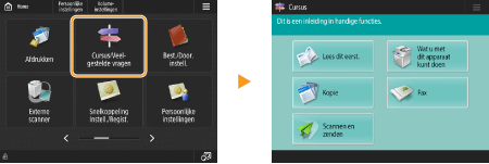 De functiegids en pagina met veelgestelde vragen bekijkenDruk op <Cursus/Veelgestelde vragen> om een scherm weer te geven waarop wordt aangegeven wat u kunt doen met de functies van de machine en waarop tips staan voor het kopiëren, scannen, enz. Bekijk dit scherm wanneer u meer informatie wilt over welke functies beschikbaar zijn en hoe u ze moet gebruiken. U kunt de pagina met veelgestelde vragen ook openen vanaf een mobiel apparaat.