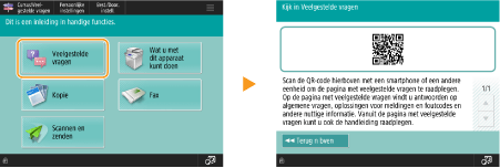 Door op <Veelgestelde vragen> te drukken wordt een QR-code weergegeven. U kunt vervolgens de pagina met veelgestelde vragen voor de machine weergeven door deze QR-code te scannen op een mobiel apparaat zoals een smartphone of tablet.