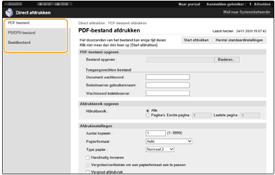 voer het wachtwoord in [Document wachtwoord]. Voor het afdrukken van PDF-bestanden die zijn gekoppeld aan de beleidsserver, selecteert u [PDF-bestand opgeven]
